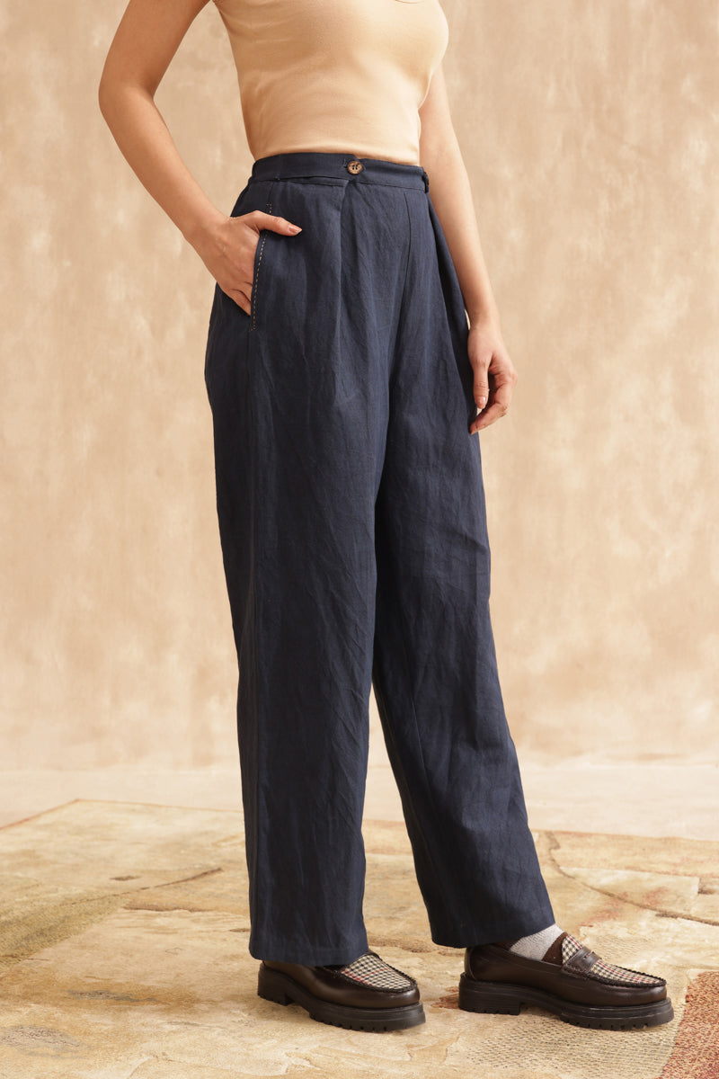 Straight fit structured trousers in deep indigo. Detailed with multiple waist buttons, adjustable strap, and elasticated back for comfort. Contrast kantha handwork highlights the pockets.