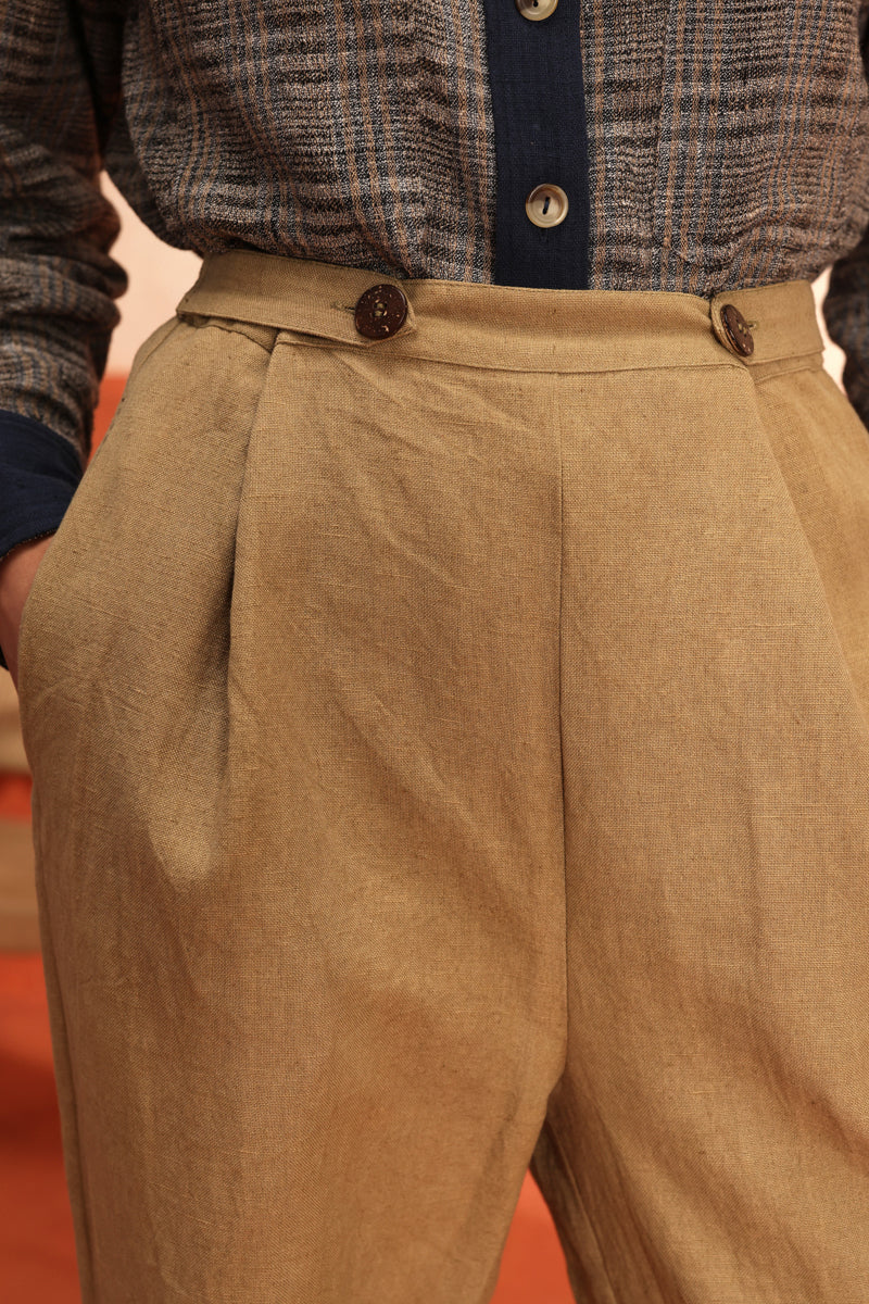 Straight fit structured trousers in olive colour. Detailed with multiple waist buttons, adjustable strap, and elasticated back for comfort. Contrast kantha handwork highlights the pockets.