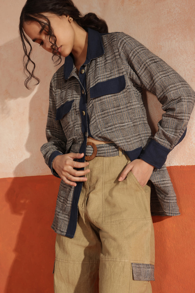 Loose-fit olive cargo pants with contrast checked pocket flaps and belt strap. Finished with a wooden buckle, elasticated back, and tie-up belt for comfort.