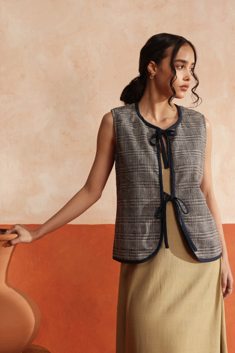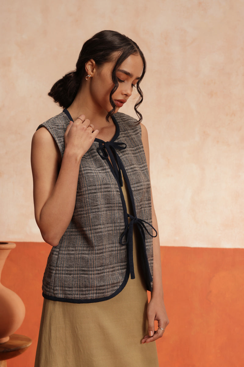 Sleeveless jacket in navy-olive checks with contrast navy lining. Tie-up chords provide adjustable fit and ease, highlighted with contrast detailing.