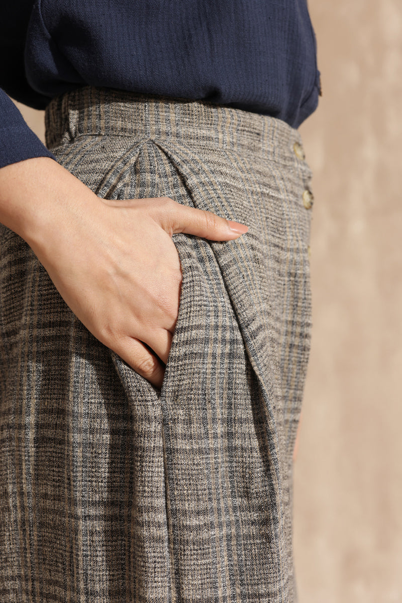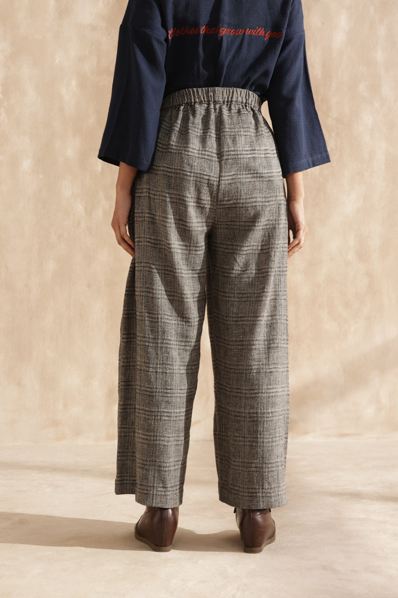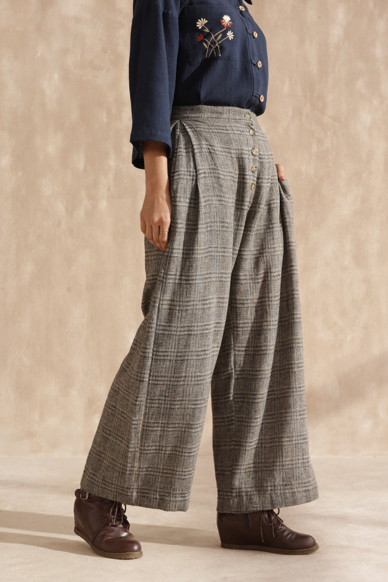 Wide-bottom flared pants in checks with pleat detailing along the sides for added volume. Elasticated back for ease and multiple button details on the front for versatility.