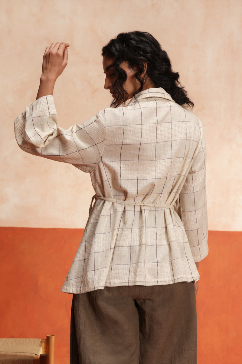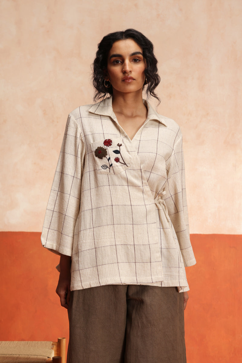Asymmetrical shirt in soft handwoven off-white checks. Finished with a tie-up dori for size flexibility and floral hand embroidery on the pocket.