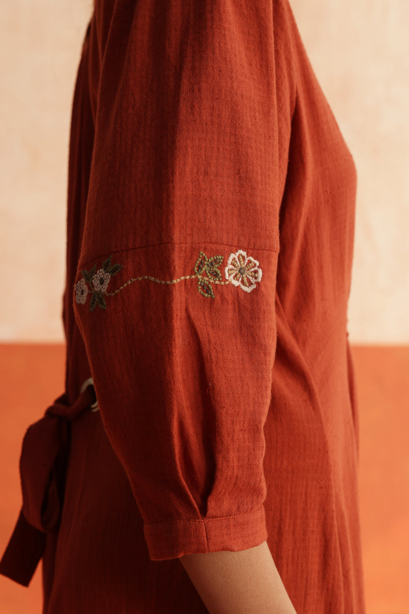 Rust-coloured flared dress with balloon sleeves. Accented with floral embroidery on sleeve panels and back neck. Waist gathered with smocking detail and pleated back finished with tie-knot and metallic eyelets for flexibility.