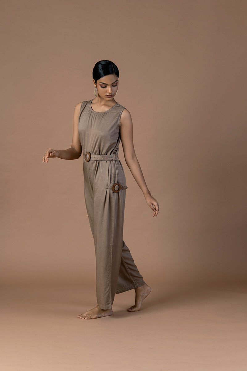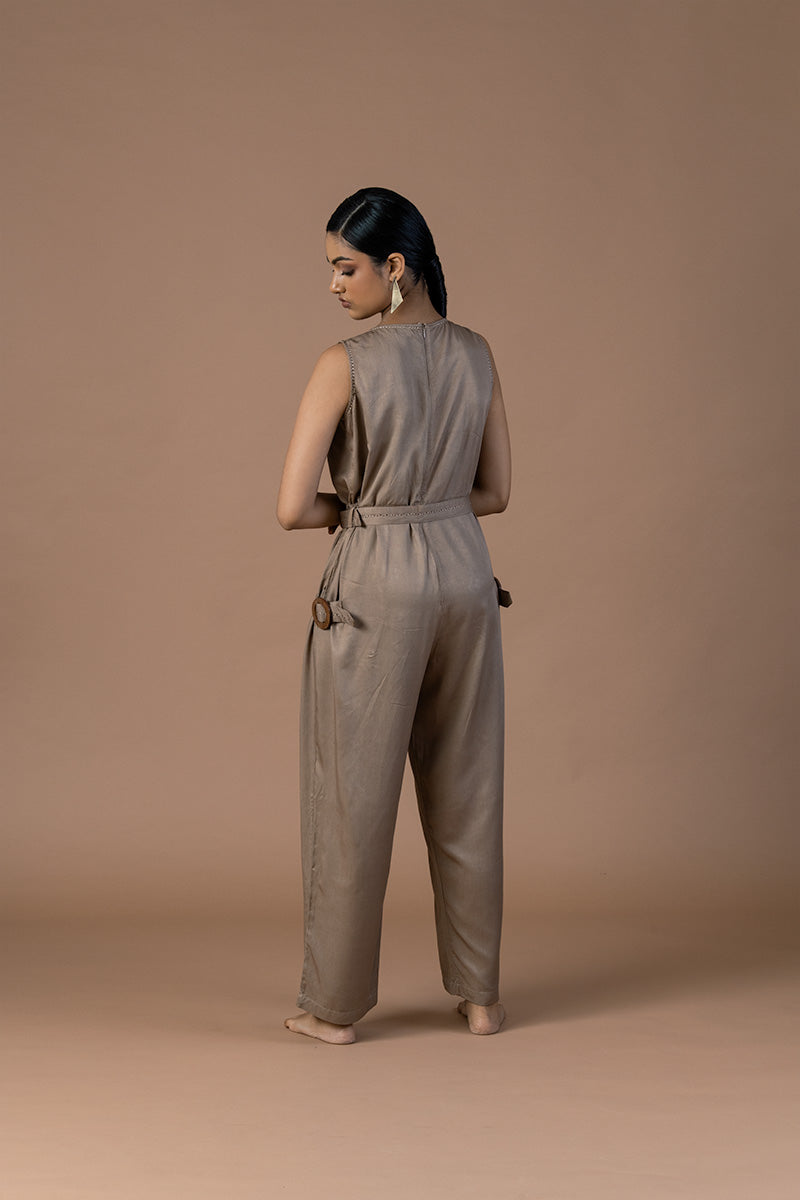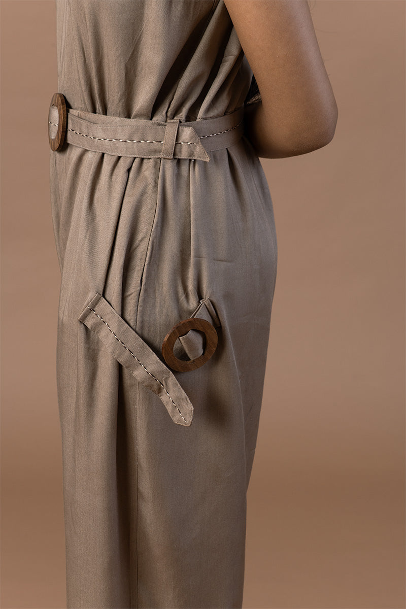 Semi-formal looking jumpsuit with wooden buckles and fabric belts. Fit and look can be adapted with these details. Details are highlighted in contrast thread handwork using unique stitch technique.