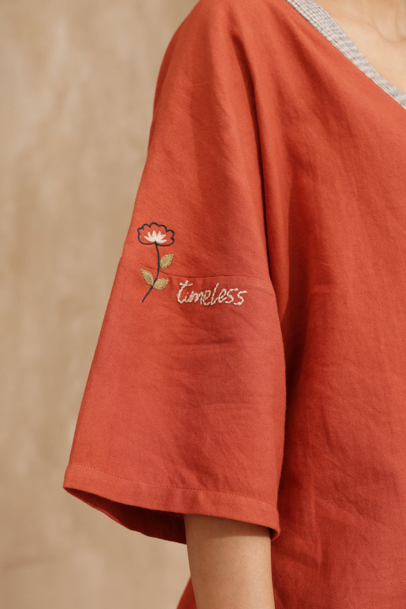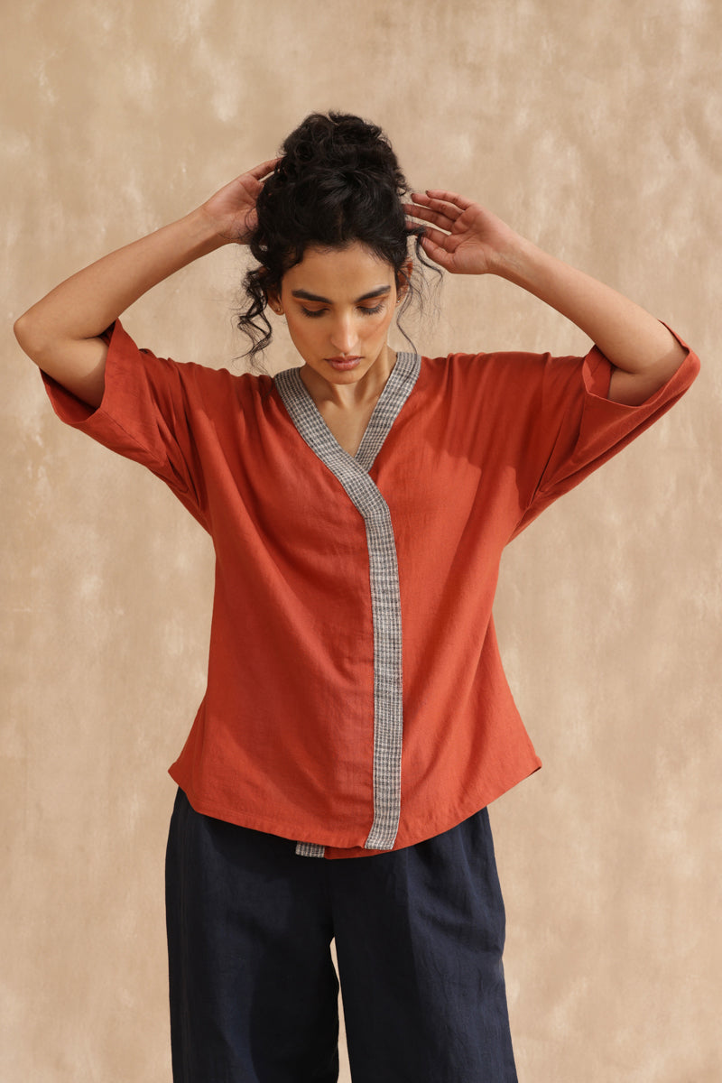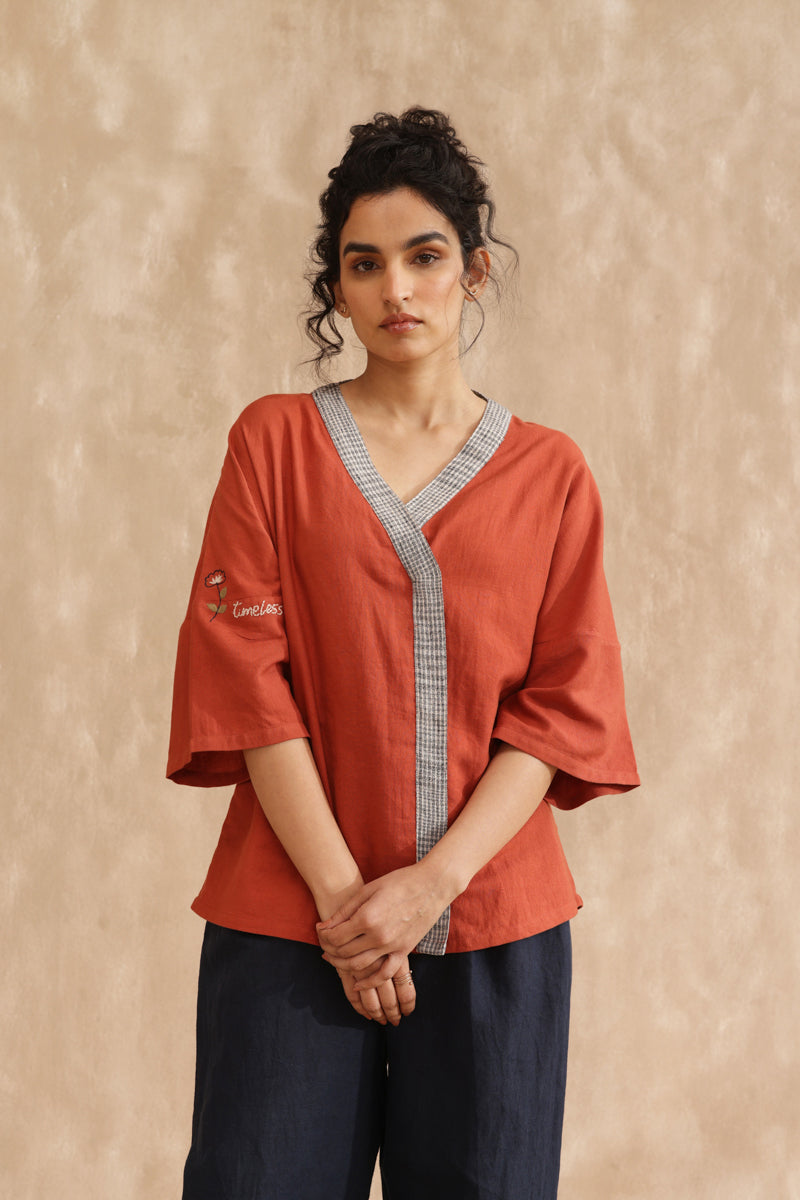 Loose-fitted kimono style top in rust with contrast check detailing at the neck placket and back belt. Tie-knot at the back for adjustability, adorned with floral and text hand embroidery across sleeve panel seams.